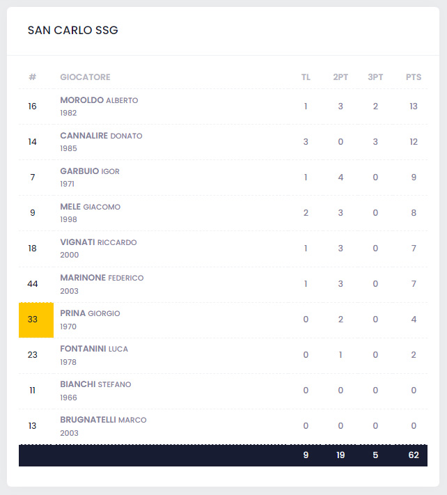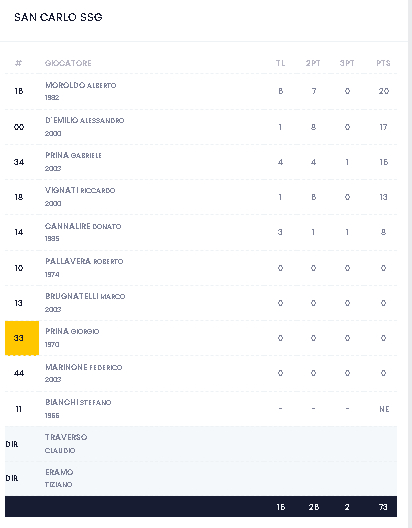 STATISTICHE SAN CARLO SSG vs IMB TIGERS 73-89