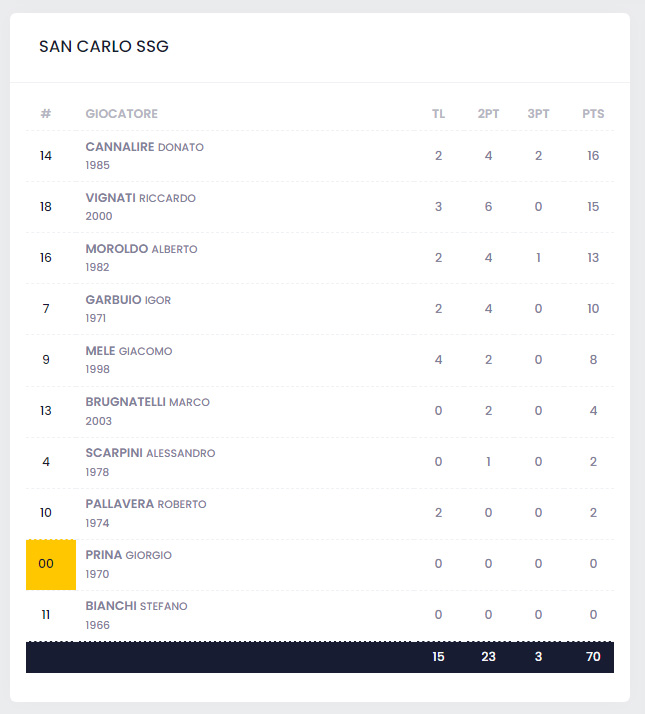 STATISTICHE  IMB TIGERS vs SAN CARLO SSG 70-66