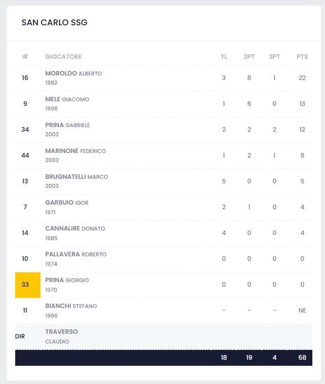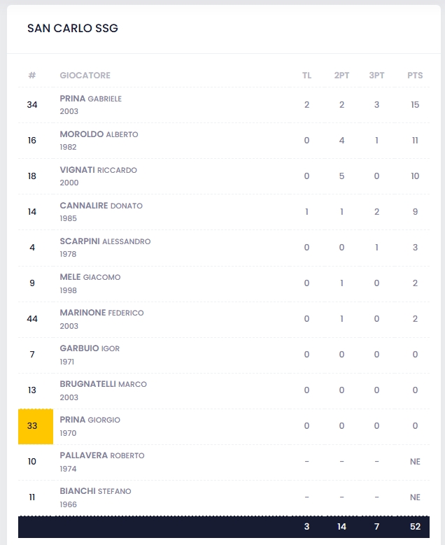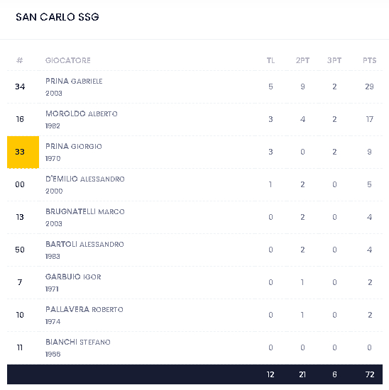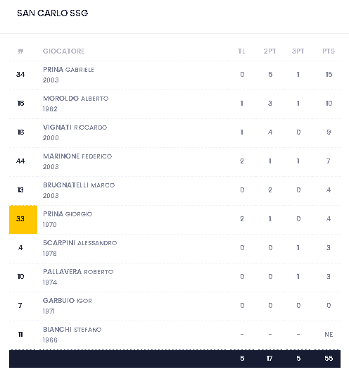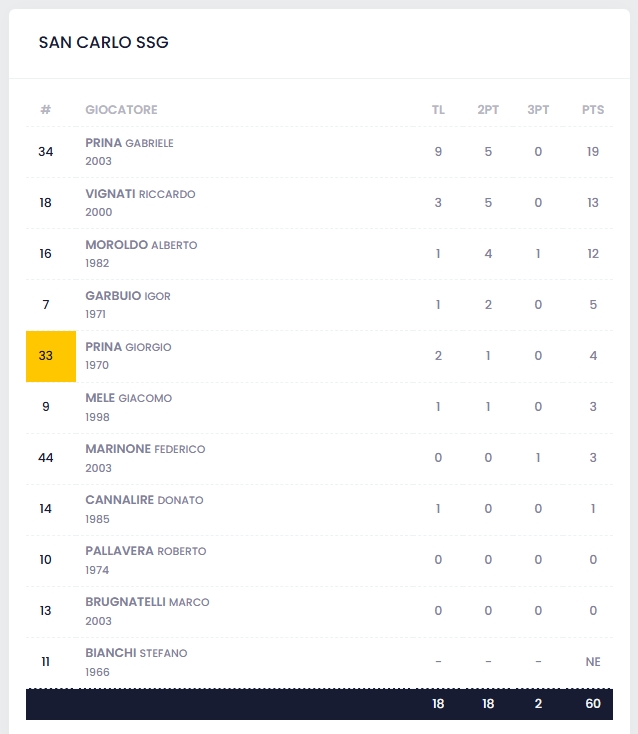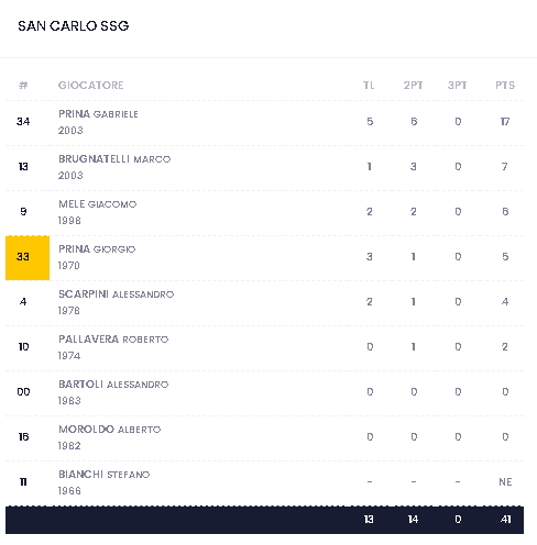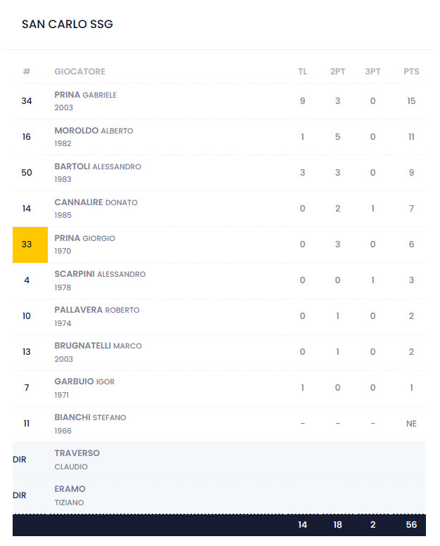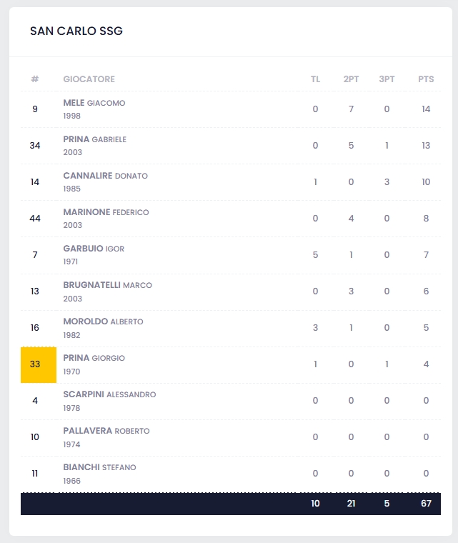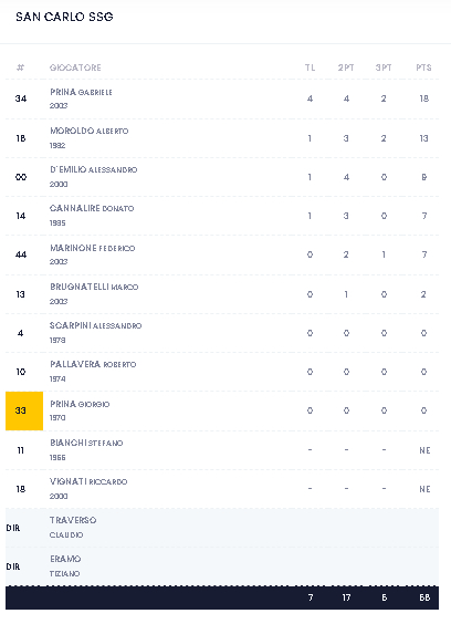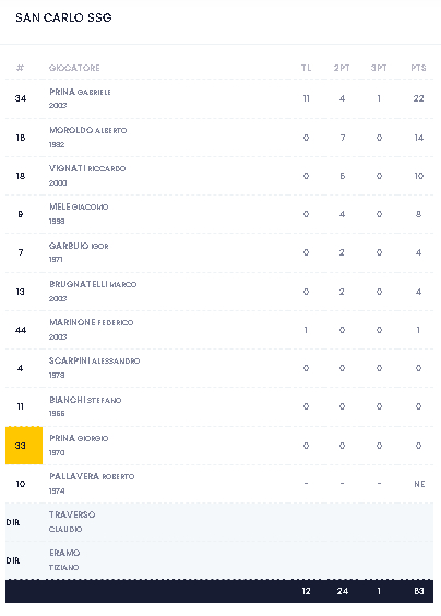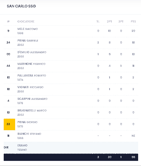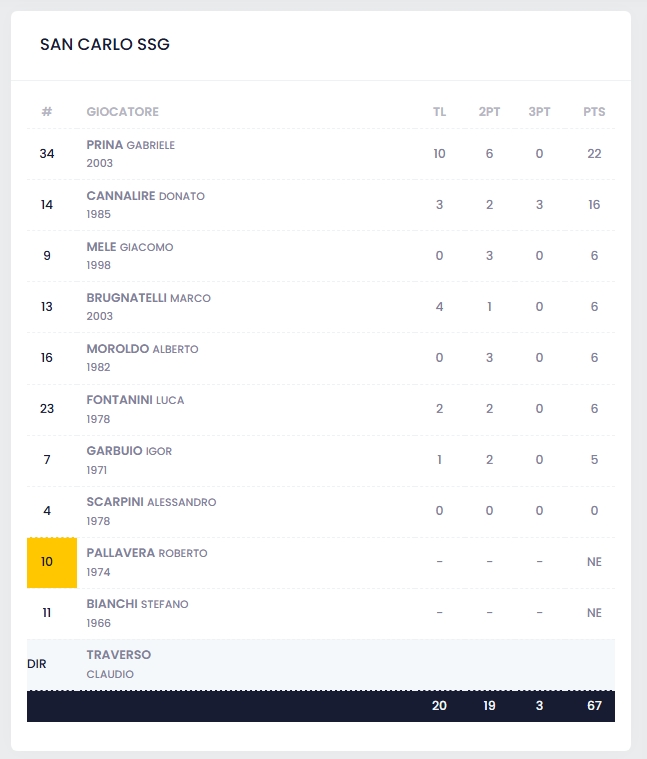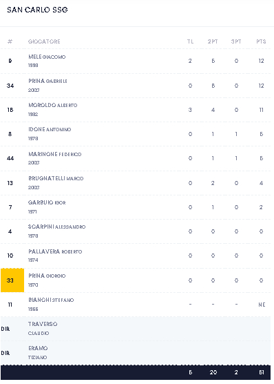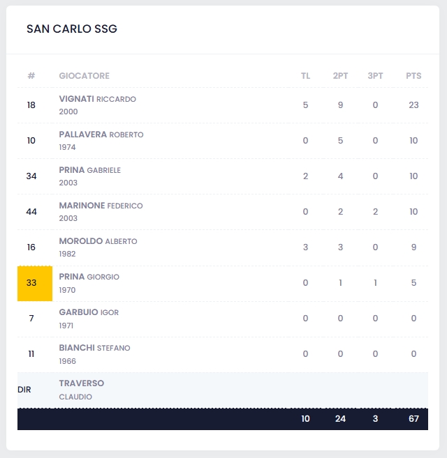 STATISTICHE SAN CARLO SSG vs INCREDIBILE 67-70