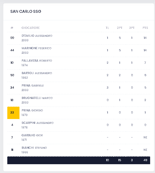STATISTICHE SAN CARLO SSG vs ASD SAN PIO V 49-70